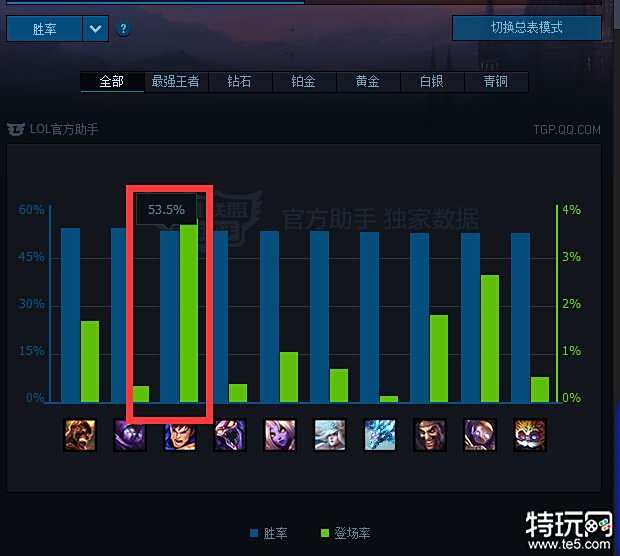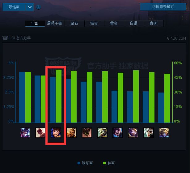 之前的盖伦是名不见经传的,大家可以看到现在盖伦的出场率与胜率都是第三名,无论是王者还是青铜都有盖伦出场,说明他真的很犀利!