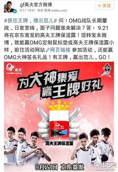 OMG电子竞技俱乐部素来以综合发展见长,虽然成绩不是最好,但经常在其他领域有所涉猎,获得了大量粉丝的支持。去年S4出征前他们就发行了脍炙人口的单曲《星球之光》,并亲自出演MV,让我们感受到了他们的颜值与唱功。今年他们虽不幸未进S5,但勤奋的OMG战队没有选择提前放假,而是去军训“戒网瘾”,有三名少年成功AFK,走向新生。而最近,星球之光迎来了新的篇章,他们代言了中国化妆品第一个男性化妆品品牌高夫。下图是高夫官微的连续宣传: