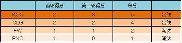 Koo输给FW,FW输给PNG,CLG输给Koo。2、2、1、1的积分构成,让A组看上去有些焦灼。