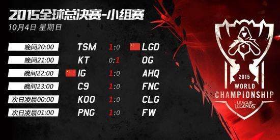 本周,《英雄联盟》2015赛季全球总决赛小组赛首轮比赛全部结束,回顾这周中国战队的表现不禁令人失望。在最后一日(4日)的比赛中,LGD再负一场出线机会渺茫,IG力战AHQ取胜拉回士气。在其他比赛中,KT不敌OG,C9战胜Fnatic,CLG负于KOOTigers,PNG则战胜FW。从目前的形势来看,OG只要再赢一场,就确定可以小组出线,KT也有较大机会,而LGD的出线则只存在理论上的可能。