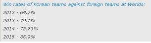韩国人的统治力不是偶然的。而目前韩国战队在世锦赛上战绩为24-3,仅仅输给过OG和FW。考虑到世锦赛尽可能照顾所有赛区,所以即便欧美捞比排名比韩国战队低100名也有总决赛名额。而欧美战队目前亚历山大的原因主要在于中国战队被扫地出门,让我们看看韩国战队历年来的胜率: