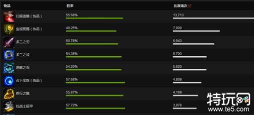 我们无法S5赛场上装备的使用数据,但是我们可以获得我们一区最强王者段位的装备使用数据,下面图片展示着前8位装备的使用次数以及胜率:
