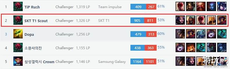 可以看到,SKT竟然有3名中单选手,除了我们熟悉的faker和easyhoon外,还有一名ID为scout的新人。这名新人可不简单,在3只韩国队伍出征S5世界总决赛期间,scout打到过韩服第一的位置,为SKT保住了招牌,现在跌至韩服第二。