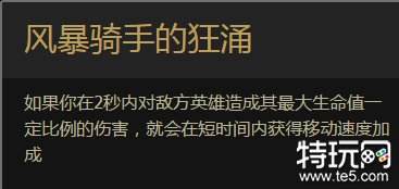 1 风暴骑手的狂涌:每当你对一个敌方英雄在2S 内造成其最大生命值的30%的伤害,会让你获得35%的移动速度加成,持续3秒(10秒冷却)。