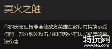 3 冥火之触:你的伤害型技能,会使敌方英雄在3秒内受到额外魔法伤害,数值为6+50%额外AD+20%AP(范围伤害和持续性伤害的效果会减半,同时持续时间变为1.5秒)。