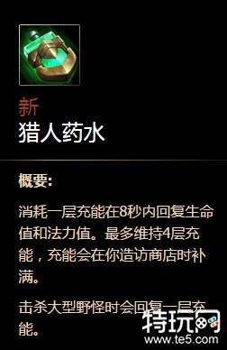 猎人药水能够让改变无伤打野英雄在S5横行的局面,由此一些拥有更加强大的Gank能力的有伤打野英雄可以顺势崛起:皇子,鱼人......猎人药水充能功效可以让打野英雄在前期拥有更加强大的续航能力,不仅仅恢复生命值,而且恢复法力值,着实弥补了现如今野怪较伤的局面。