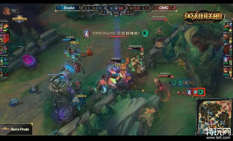 四强争夺战中,他们对阵的是Snake。在第一场比赛中,OMG COOL的韦鲁斯大杀四方,尤其是下路一波围剿使得OMG拿下了四个人头并获得了一条小龙,OMG顺利拿下了首局比赛。而第二局Snake打野的针锋相对寸土不让,又扳回一城。OMG也不甘示弱,第三局立刻改变了战术,导致Snake上单被针对,开团乏力,而第四局虽然Snake一直苦苦支撑却难改其颓势,OMG North的爆炸输出以及团战时安妮和酒桶的先手配合,使得OMG成功与EDG会师决赛。