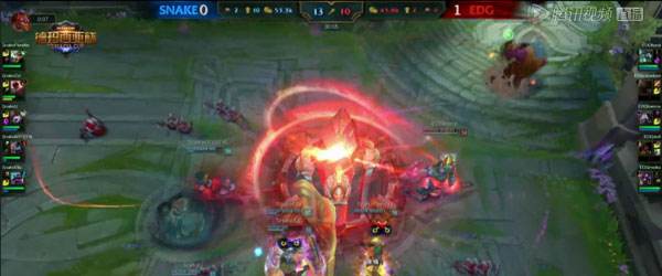 随后双方将下路调至中塔健在的中路发育,而Snake圣枪哥也已经只能在塔下猥琐收兵发育。也正是由于上路的劣势,导致EDG总能在团战中占据优势,使得经济持续差持续被拉开。