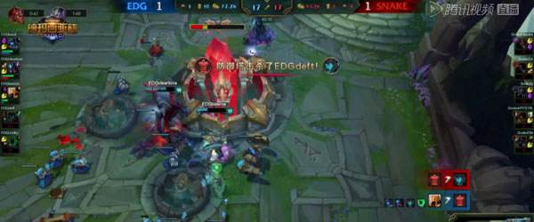 开局EDG果断选择了换线,而Snake则仍旧采用速推的战术,在3分半钟左右就拿掉EDG的下路一塔。而推掉下塔后,Snake顺势拿掉小龙。换回线后的Snake又进行速推,早早拿掉EDG上路一塔,并且Snake的中单U在双方均有闪现且没使用的情况下单杀对面。