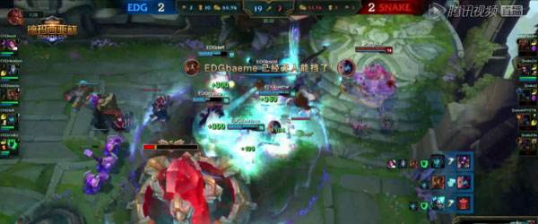 而随后EDG持续对上路进行针对,导致Snake双人路和上单路均无法正常发育。之后圣枪哥只能选择猥琐发育,EDG并无办法在上路打开局面,所以转战下路进行针对。节奏也慢慢转到EDG手里。