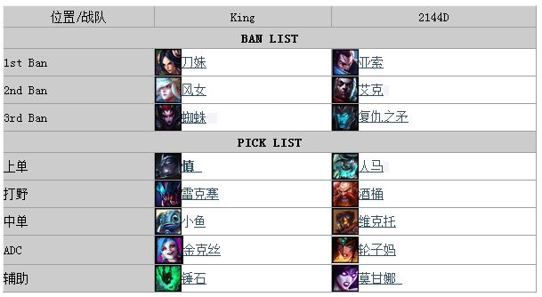 LPL职业联赛2015夏季赛 Kingvs 2144D,以下是本场比赛的战报: