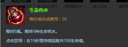 使用频率最多的药水,没有之一。不管是哪个位置都会用红药水。但是在打野位置上出不是所有英雄都应该出这药水的。这个就要说红药水所带来的效果了。首先,他的价格很低。在出了打野装备之后,剩下的钱可以购买三瓶红药水。所带来的回复量能回复英雄的四分之三。那这么高的回复量为什么不是适合所有英雄出的呢?因为这是一个消耗品,喝了就没了。不能二次使用。所以,红药水和刷野型英雄属性十分不相配。因为刷野型英雄到6级很难Gank。所以往往在刷完第一波野的时候就回家了。而且,刷野型英雄因为其快速的刷野速度或者回复能力让自己的损耗变得非常少。但是,Gank型英雄就不一样了。他们在前期就需要去线上Gank,甚至在自己刷到2级的时候,也就是只刷掉第一组野怪就会去线上Gank。这个时候需要弥补大量损失生命值,让自己有足够的血量去线上Gank。