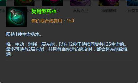 在打野位置里十分冷门的药水。理由很简单,回复量不够多。人家红药水一个就能回复150的生命值,而复用型药水只能回复125。150人家能卖三个,而一个复用型药水只能回复两次。回复量少了一瓶半红药水。所以基本上没人选它。但是这个药水真的说的那么不堪么?本宅觉得未必。复用型药水在购买以后可以随着每次回家出装来免费获取回复量。换句话说,随着时间的变长这药水的性价比会越来越高。虽然回复量比红药少,但是只要不需要大量补充生命值的情况,复用型药水所带来的回复将远远大于红药。可谓是一次投资终身受益。因为刷野型打野不需要常去线上Gank。所以没有需要那么大量的生命回复,所以出这个足够,而且他可以后续升级。完全可以让这些打野快的英雄度过中前期。