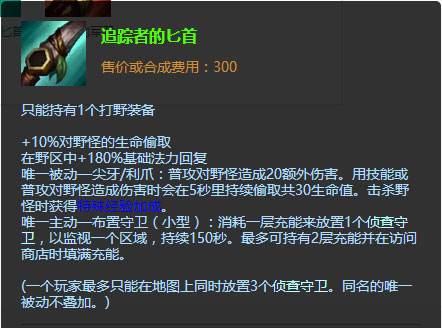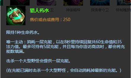 复用型药水的升级版,一个对于刷野型打野最具性价比的装备。因为刷野型打野的主要目的不是Gank,而是快速到6。所以,如果能减少回家时间,那么相对就能增加打野时间。从而通过获得大量野怪的经验快速到6。在过来6级之后,这件装备仍然有用。因为它每击杀一个大型野怪就会获得充能,并且在有满层充能的时候会直接转化为回复。这样在反野和刷野的时候就能大大减少回家的次数,从而在保证有一个健康血量的同时增加刷野速度。基本上,这件装备可以用到出一两件成装之后。
