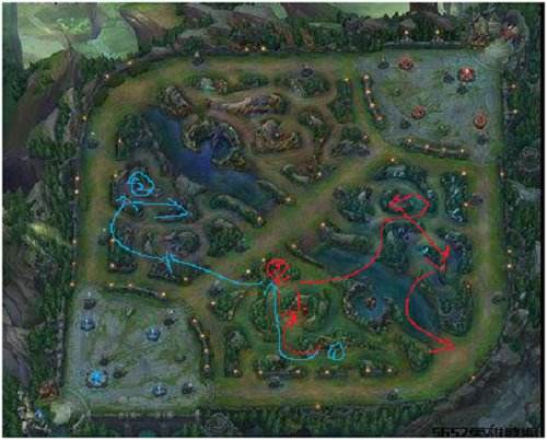 蓝色线路:这次刷红是因为怕对面到时候来反红,给对面留下反而得不偿失,刷到3狼,惩戒3狼。发现如果3狼没有了、或者蓝buff没有了、或者对面打野抓下。就说明野区被入侵了就走红色路线。如果没有就走橙色路线。同样回家红色惩戒。