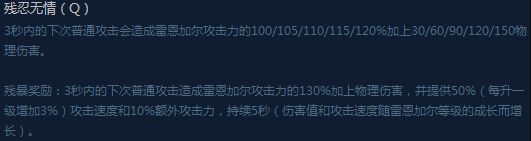 狮子的Q技能是他伤害的主要来源之一,关于数据不用记牢,只需要知道不论是残暴Q还是普通Q,只要攻击力越高,那么伤害就越高,同时残暴Q命中后会提高攻击力和攻速就行了。