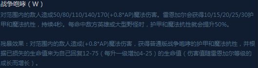 狮子的W可以造成一定的魔法伤害,并且提供一定的双抗。当W命中敌方英雄或者大型野怪时,W所提供的双抗会增加50%。残暴W能够根据自己以损失的生命值来回血,你的血越少,残暴W能够恢复的血就越多。