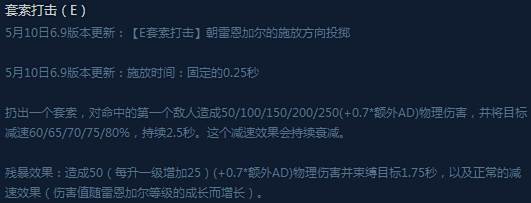 狮子的E是他唯一一个控制技能,普通的E能够减速,而残暴的E能够禁锢敌人。因为E技能的抬手现在有固定的0.25秒延迟,所以不用追求跳向敌人的一瞬间就将E技能丢出去,只要在打完自己的爆发,进行追击的时候尽可能的让E命中就行了。