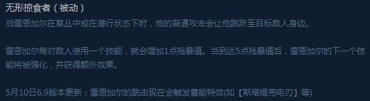 这是狮子的被动,在草丛或潜行状态下普攻能够跳跃到目标身边。每对敌人使用一个技能,就会增加1点残暴值,当残暴值达到5点,下一个技能会被强化并且获得额外效果。