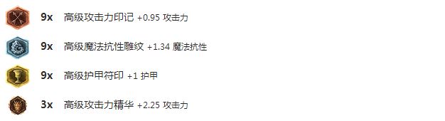 红色攻击力x9,蓝色固定魔抗x9,黄色固定护甲x9,精华固定攻击力x3