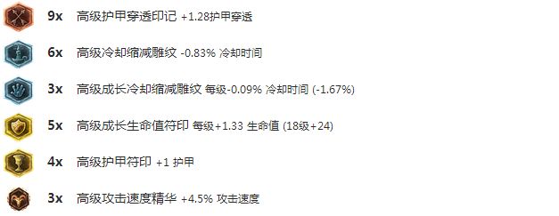 红色固定护穿x9,蓝色固定冷却缩减x6,蓝色成长冷却缩减x3,黄色固成长生命x5,黄色固定护甲x4,精华攻击速度x3