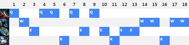 加点方面,主Q副E,2级点W。2级学W能够在刷野时增加一定的双抗,减少2级期间刷野的血量消耗,并且W是AOE技能,清野效率要比E技能更高。