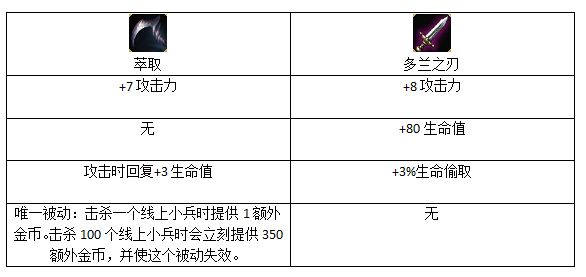 在平时,大家出门的时候也许都会习惯性的选择多兰剑来作为自己的出门装,而萃取则很少会考虑。这是一个习惯问题,但实际上选择萃取的优势远远大于多兰剑。让我们来对比一下两件出门装的属性: