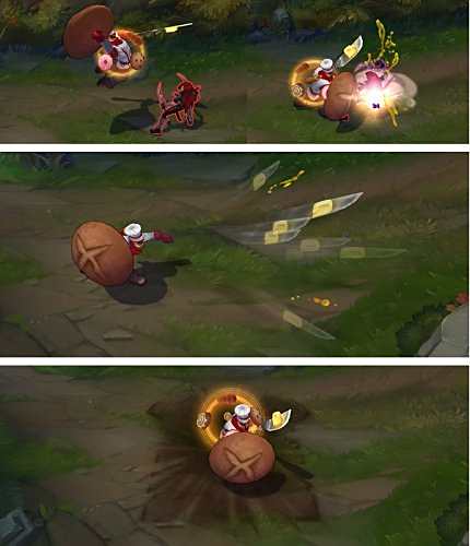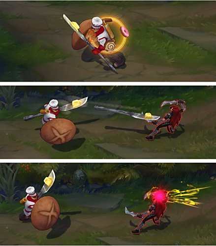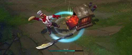 作为大厨系列里唯一的一个全特效,自然是会有回城特效的。回城特效正是潘森烤面包时候的样子。在把一个面胚扔进烤炉之后蹦出来的是一个和盾牌一样大的面包。如果仔细听,还能听见烤箱计时器的声音。而随着周围的高温,刀上的黄油渐渐化掉了。在细节上依然是做的很完美。