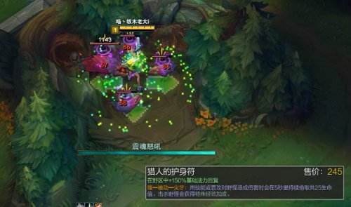 当一波gank之后,血量很低的你觉得自己无法刷野或者发起下一波gank,不得不回家补充血量时,你可以利用打野护符的被动在F4这里快速回血,可以是W踩住后E走,这样你会在5秒内回复25*4=100点生命值!拉远后等到仇恨消失,回头后可以利用Q技能重复此动作,(技能打中4个怪,走开,有E最好,没有E可以用Q技能做位移)这样每5秒回复100点生命值,比什么血瓶都厉害的多啊!