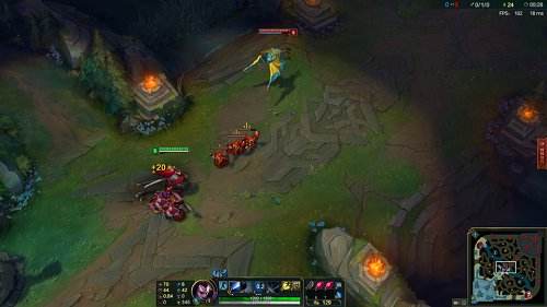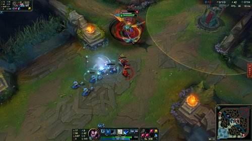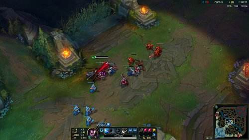 叠加了E技能的两层被动以后,使E技能伤害最大化,再加上Q技能触发了不灭的额外魔法伤害和Q技能本身的伤害,这个技巧可以使不灭剑豪前期的伤害最大化。而且图中还有两只没死的敌方小兵,其中一只没有显示有E技能被动,可以直接E这只小兵回来。这个技巧相当考虑玩家的反应速度和清晰的换血思路,如果没有尽快E回来,一旦被对方直接控制,敌方队友正好赶到,则剑豪将会进入1V2的危险局面。
