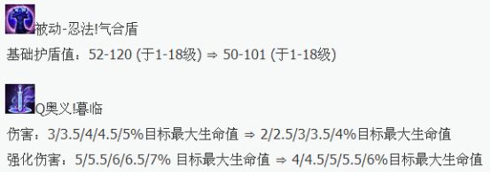 削弱了慎被动护盾的数值,从1级到18级都有明显的削弱,通过计算可以发现,削弱前,每一级所提升的护盾值为4,削弱后为3,实质上并没有太大的区别,当个位数为1的数据在你面前时候,就显得可有可无了。所以我认为,护盾值的削弱,并不能算得上是削弱,只是一个单纯的数据修改。