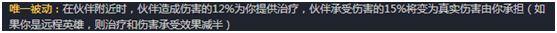 唯一被动:在伙伴附近时,伙伴造成伤害的12%为你提供治疗,伙伴承受伤害的15%将变为真实伤害由你承担(如果你是远程英雄,则治疗和伤害承受效果减半)