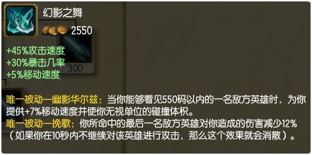幻影之舞,简称绿叉。它的唯一被动——挽歌可以让你所命中的最后一名敌方英雄对你造成的伤害减少12%。换言之就是在面对自己正在攻击的敌方英雄时,获得12%的伤害减免。