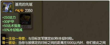 基克的先驱,主动技能可以与一名队友进行绑定。当你与被绑定的队友之间的距离在1000以内时,你们彼此之间会产生充能数,攻击或施法会产生额外的充能数。而当充能数达到满层时,下一次造成伤害会为你与被绑定的队友提供20%的法术强度和50%的暴击率,持续8秒。