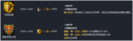 军团圣盾与钢铁烈阳之匣价格大幅下调,但是被动提供的魔抗光环也被删除,同时基础属性调整为同时增加护甲与魔抗。钢铁烈阳之匣的主动群体护盾得到增强,现在的护盾值几乎是之前的2倍,并且持续时间提升到了2.5秒。