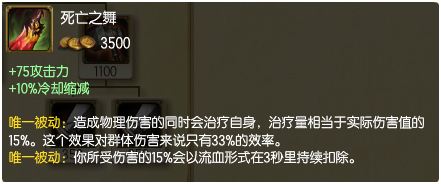 死亡之舞,简称死舞。它的唯一被动可以让自己所受的15%伤害以流血的形式在3秒里持续扣除。同时在造成物理伤害的时候会治疗自己,治疗量相当于实际伤害值的15%。在战斗中治疗量与流血效果相互抵消,实际上也几乎相当于获得了15%的伤害减免(还记得嗜血绿叉死舞流的男枪吗)。