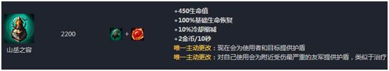 山岳之容现在的护盾使用后会给你以及目标同时增加护盾,护盾值为你最大生命值的10%。通常坦克辅助在中后期都拥有两三千的血量,也就是说护盾值很容易就能达到两三百点。