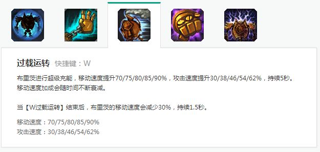增加移速与攻速,机器人游走成功有一半是这个技能的关系吧,失败的一半也是这个技能,削弱后的W技能持续时间结束后会减速30%的移动速度,这意味着机器人在前期gank时对W使用的时机把握要求更高了,很多情况是W还没跟上去时间结束,自己被减速而错过了一次gank的机会,所以得出结论是,W也不能随便开。