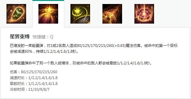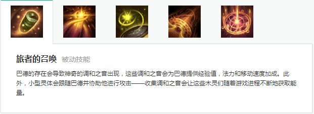 被动:在地图随机生成调和之音,如果要说巴德成为一个游走支援型辅助靠的是E技能强大的地图跨越,亦或是Q和大招的控制链,那么,被动将是作为巴德的一个跳板,被动的特性是收集调和之音后提供移动速度和回蓝,还有最重要的一点,每个调和之音收集后增加20点经验值并在5分钟后按等级每级增加一点,生成时间是开局后35秒,也就是说,开局巴德与敌人对线前就可以先拿到被动的第一波经验,根据小编的经验,上线前巴德的被动至少能刷出来三个,20*3=60,一个近战兵=63经验,巴德再上线时就有领先敌方一个近战兵的优势,合适时可以配合AD压线抢2优先打一波,在非常早期就滚起小雪球对对方AD来说是一件非常蓝瘦的事情。