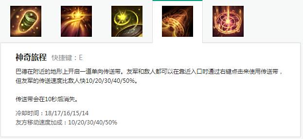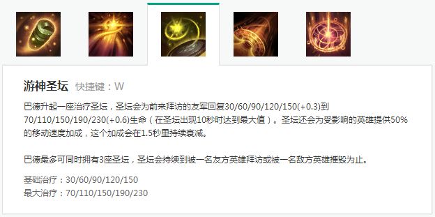 W技能游神祭坛:此技能使得巴德在线上有一定的恢复能力,换血更加的大胆,1级W就能提供50%的移速加成,如果线上抢2,果断交W给你的AD吧,他能够创造奇迹的。