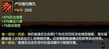 提供40%的攻速加成,30%的暴击几率以及7%的移速,同时飓风弩箭可以暴击