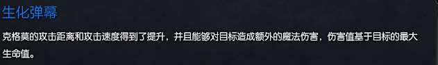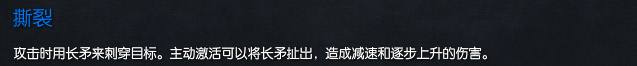 25的攻击力加成,40%的攻速加成以及10%的生命偷取。攻击被动造成目标当前生命值额外伤害,主动释放可以造成基于最大生命值的额外伤害同时偷取生命值和移速。
