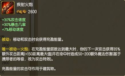 提供30%的攻速,30%的暴击以及7%的移速,唯一被动可以储能后增加你的下次攻击射程以及伤害。