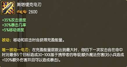 提供35%的移速,30%的暴击以及5%的移动速度,储能后攻击触发连环闪电造成额外伤害