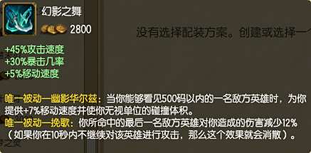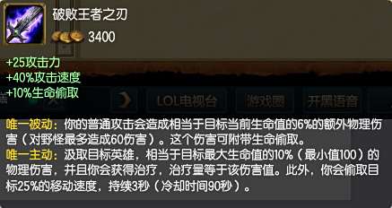 之前是红叉,现在是绿叉。提供较高的攻速加成,价格比前三件贵了200金币。这件装备偏向于保护性。当你看到敌方英雄时你的移速会获得加成。同时你攻击的最后一名英雄对你的伤害会降低。当敌方刺客突进能力非常强的时候,你还是选择出幻影之舞提高生存能力。需要注意的是,只有你攻击了敌方英雄它对你的伤害才会降低,也就是说如果他直接突进进来瞬间将你秒杀的话,是无法触发减伤效果的。