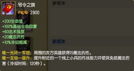 号令之旗是一件比较冷门的装备,由军团盾和恶魔法典合成,总价格2900金币,属性有60点法强、10%冷却缩减、200点生命值、20点魔抗和100%基础生命回复,被动技能军团盾光环,为附近的友方英雄增加15点魔抗。主动技能晋升一个小兵,提升这个小兵的作战能力并且免疫魔抗。除了超级兵以为,近战小兵、远程小兵和炮车都可以晋升,由于炮车的血量和攻击是三种普通小兵中最出色的,并且炮车还能减免防御塔的伤害,所以晋升炮车的收益最高。晋升后的炮车的作战能力就相当于一个超级兵了,尤其是在中前期还没攻破对面水晶的时候,晋升炮车的作用非常明显,只要对面不尽早击杀这辆炮车,那边它就很容易把兵线推到敌人腹地,进而威胁到对面防御塔。