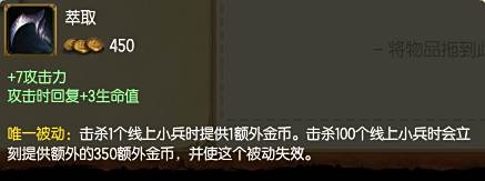 萃取虽然在基础属性上要低于多兰之刃,但是萃取打钱的被动才是最被看重的。萃取的被动是:击杀一个线上小兵提供1额外金币,在击杀100个之后会额外增加350金币,然后这个被动失效。在补兵100个之后,萃取一共提供了100+350=450金币,萃取提供的额外金币已经相当于一个半的人头赏金了。尤其是在中前期对局都是以发育为主的情况下,人头不容易爆发,只要补刀达到100个,就会比对面多出450金币,萃取可以说是一件ADC的工资装。那么补兵达到100个需要多久的时间呢,在职业选手中一般11分钟左右就可以补兵过百,普通玩家补刀功底要差很多,只要在线上不出现天然崩,一般也就15分钟左右。