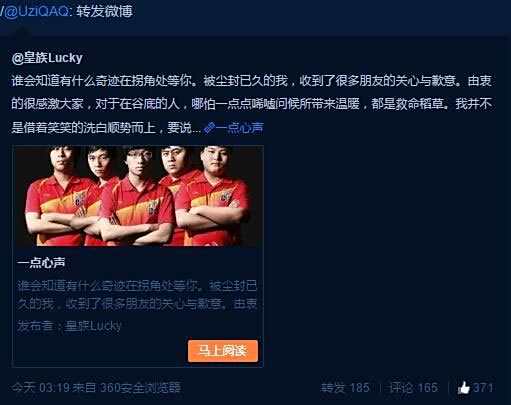 笑笑前两天谈及到了LPL现状引发了众多网友的热议,其中谈及到的人物众多,前S系列赛亚军皇族打野Lucky也是其中一位。在12日凌晨,Lucky通过微博发表了一篇短文,曾经的队友Uzi也二话不说转发了微博,下面我们来看看这个曾经的“背锅位”的自白。