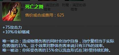 死亡之舞:相当一部分AD英雄依靠技能输出而不是平A,所以他们平A吸血效率很低,一波团也没有多少回复,这件装备从此告别了这样的尴尬。此装备让劫的综合回复可以大大提高,吸血也更加安全,远距离WQ就可以达到,避免了贴脸A的风险,同时也可以更好的进行技能消耗,十分稳健。美中不足的是它很难让劫的爆发有所增加。