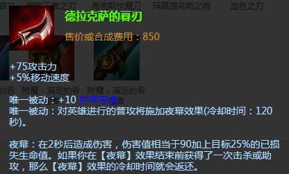 德拉克萨的暮刃:此装备配合劫大招简直是神来之笔,但“连续性伤害+平A”就可以触发其被动,也就是说劫在线上WQE消耗的时候A一下,这件装备就会触发被动,然后要等待120s的CD。所以不必消耗,要一套秒,暮刃用于劫的carry和切入都有很不错的效果。